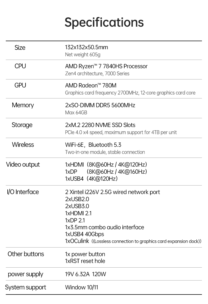 1xType-C(USB4) 1xHDMI 2.1 1xDP 2.1 1xAudio Jack 1xDC 19V 2xUSB3.2 Gen1 2xUSB2.0 1xOCulink |